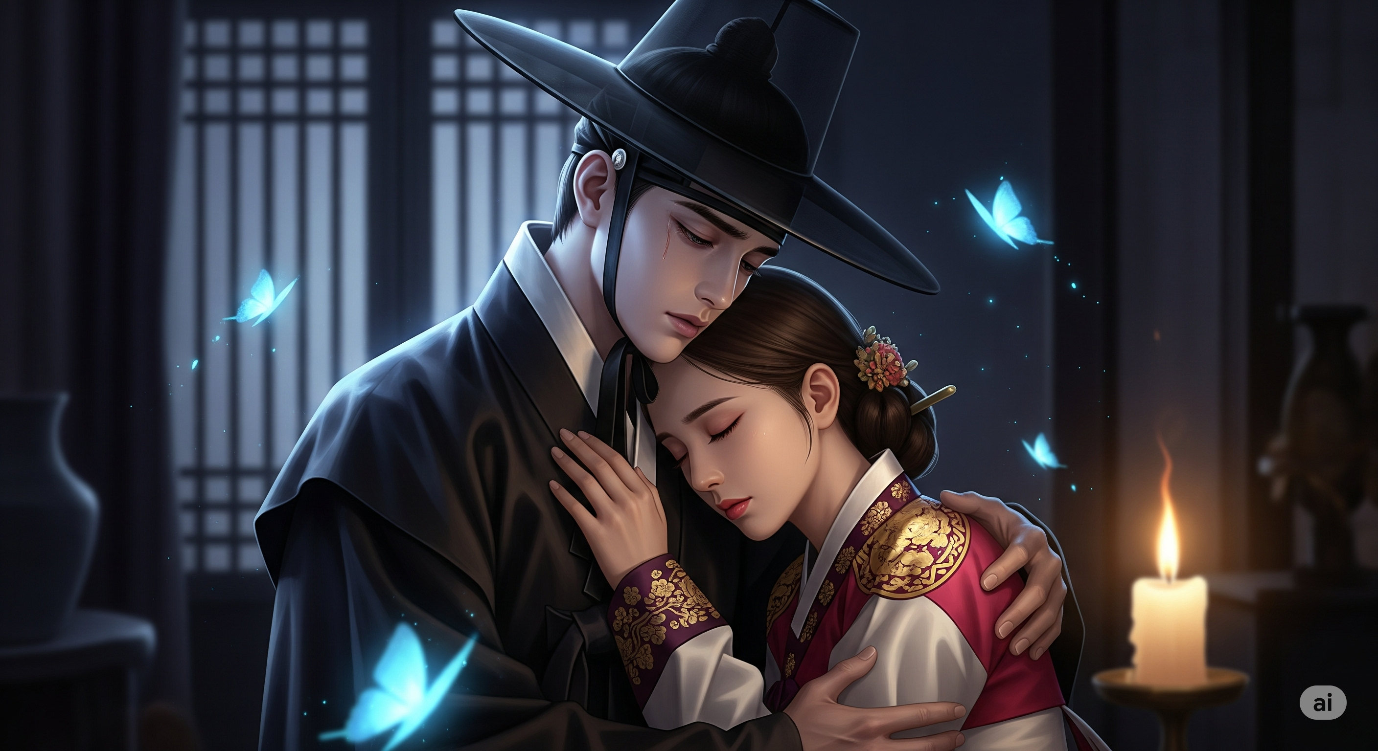 그들의 위태로운 만남이 계속되던 어느 날 밤이었습니다. 그날따라 매혹은 유난히 지쳐 있었습니다. 병조판서 김대감이 기어코 그녀의 방에까지 들어와 행패를 부렸기 때문입니다. 그는 그녀를 힘으로 눕히려 했고, 매혹은 필사적으로 저항하다 옷이 찢기고 몸에 상처를 입었습니다. 간신히 그를 쫓아냈지만, 그녀의 영혼은 이미 너덜너덜해진 뒤였습니다. 매혹은 실성한 사람처럼 웃으며 자신의 몸을 씻고 또 씻었습니다. 하지만 아무리 씻어내도, 더러운 욕망의 흔적은 지워지지 않는 듯했습니다. 모든 것에 환멸을 느낀 그녀는, 방 안에 홀로 앉아 허공에 속삭였습니다. “거기 있는 것 압니다. 제발… 나와주세요. 오늘 밤은… 당신이 필요합니다.” 그러자 기다렸다는 듯, 방 한쪽의 어둠이 스르르 걷히며 저승사자가 모습을 드러냈습니다. 그의 얼굴은 여전히 얼음처럼 차가웠지만, 그의 눈동자는 그 어느 때보다 깊게 흔들리고 있었습니다.