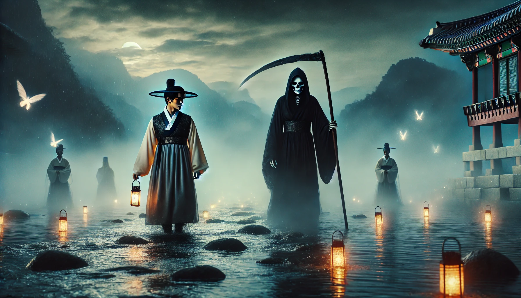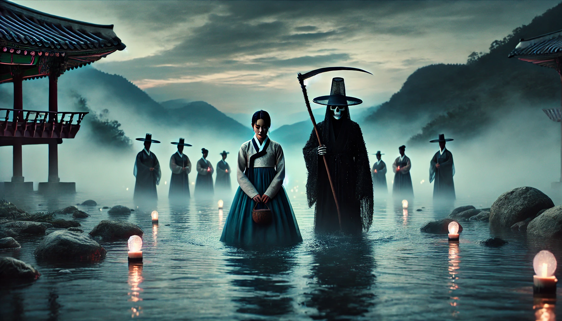 저승사자가 고개를 끄덕이며 길을 가리켰습니다. "그럼 가자. 삼도천을 건너야 한다."