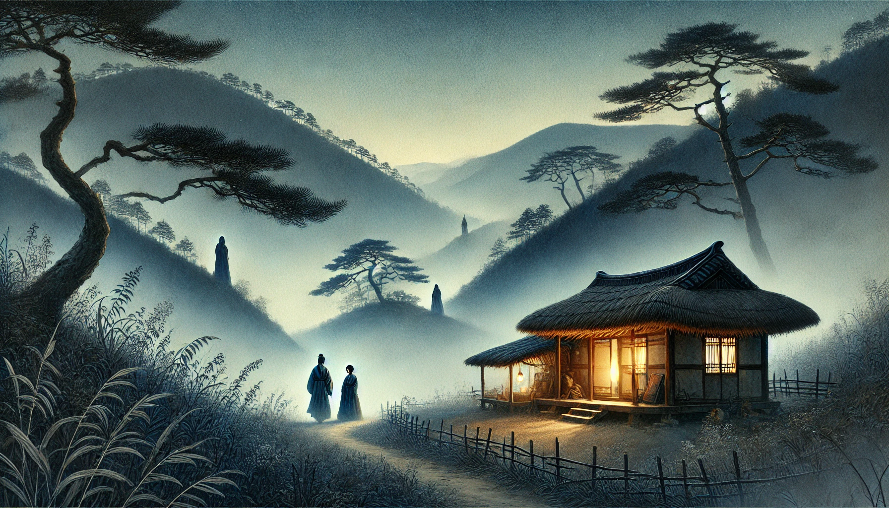 저승사자에게 묶인 박 서방의 영혼은 칠흑 같은 어둠 속에서 끝없이 이어지는 황천길을 걷기 시작했습니다. 그 길은 돌밭이었고, 사방에서는 알 수 없는 원혼들의 구슬픈 울음소리가 메아리쳤습니다. 발밑은 차가웠고, 주변의 공기는 수백 년 묵은 서러움처럼 눅눅했습니다. 그러나 박 서방의 마음은 이 차가운 길보다도 더 아팠습니다. 그의 귀에는 이승에 남겨진 가족들의 통곡 소리가 여전히 가장 생생한 소리로 들려왔습니다. "아버지! 아버지! 어찌 이렇게 홀연히 가셨습니까!" "여보, 나를 두고 혼자 가면 어찌하오! 당신의 진심을 보여주시오!"