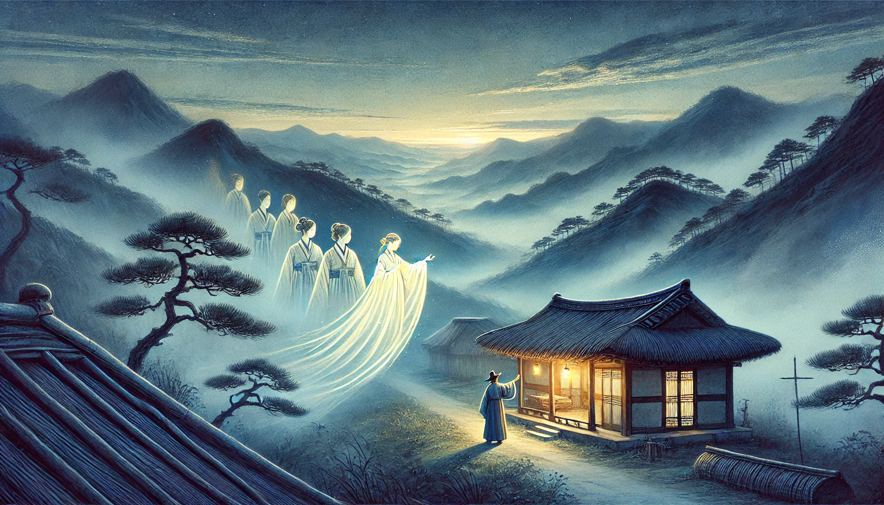 박 서방은 다시 한번 저승사자 앞에 무릎을 꿇고 애원했습니다. "나으리, 잠시만 멈춰주시오! 내가 평생 아내에게 사랑한다는 말을 한 번도 해주지 못했소. 딱 한 번만, 단 한 번만 돌아가서 그들의 손을 잡고 '고맙소, 사랑하오' 말 한마디만 전하게 해주시오! 내 영혼이 이대로는 영원히 떠돌아다닐 것이오!" 저승사자는 냉담하게 대꾸했습니다. "이승과 저승의 법은 엄중한 법. 너의 후회는 알겠으나, 이미 명부(名簿)에 기록된 이상 되돌릴 수 없다. 어서 가자." 저승사자는 쇠사슬을 잡아당겼습니다.