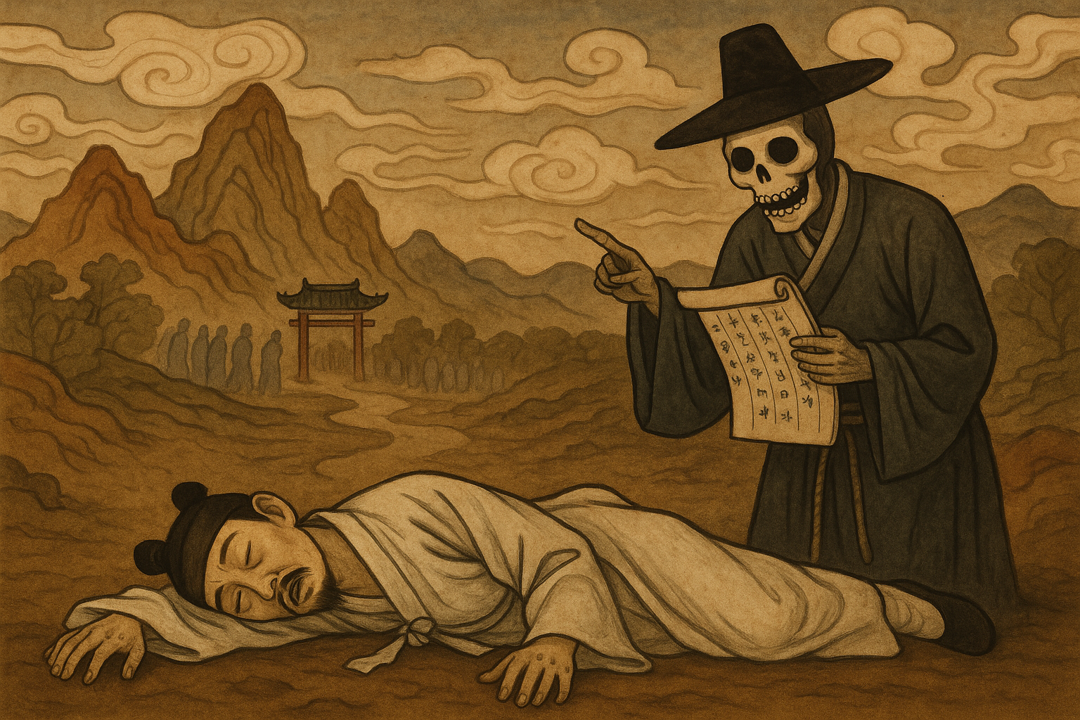 조선 후기, 한 건장한 사내가 갑자기 쓰러져 숨이 끊어졌습니다. 그런데 저승에 도착하자 저승사자가 "이상하다, 네 이름이 명단에 없다"고 말했습니다. 알고 보니 동명이인 때문에 산 사람을 잘못 데려온 것! 하지만 이미 저승에 온 이상 그냥 돌려보낼 수는 없다는데... 과연 이 사내는 어떻게 다시 이승으로 돌아올 수 있었을까요? 실제 조선시대 야담집에 기록된 놀라운 이야기입니다.
