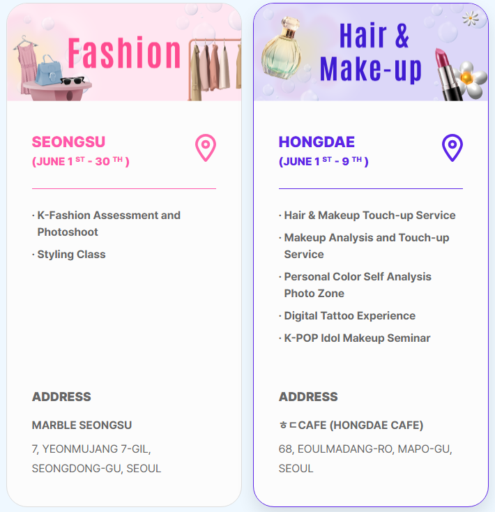 헤어, 메이크업, 패션, 의료/웰니스 등 테마별 거점 공간을 을 운영하여 K-뷰티 특별 체험 프로그램 및 다양한 할인 프로모션 등을 진행한다. 더 자세한 내용은 코리아뷰티페스티벌 온라인 플랫폼 확인할 수 있다.